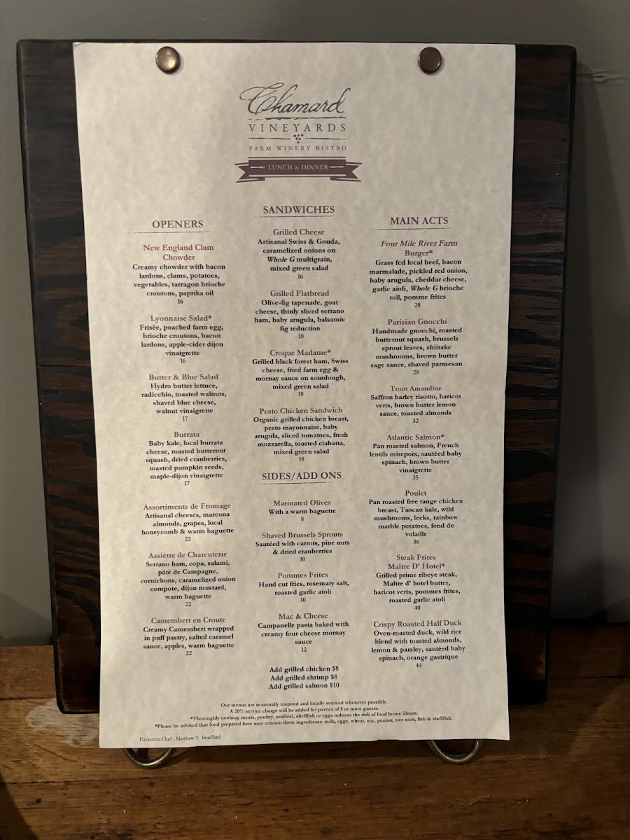 Welcome to Chamard Vineyards Bistro, a delightful French culinary gem nestled in the scenic beauty of Clinton, Connecticut. The menu offers a refreshing take on classic French cuisine, featuring highlights such as the sumptuous Lobster Bisque, rich with butter-poached lobster and fragrant basil oil, and the vibrant Burrata Berry Salad, a symphony of local burrata, fresh berries, and toasted almonds.